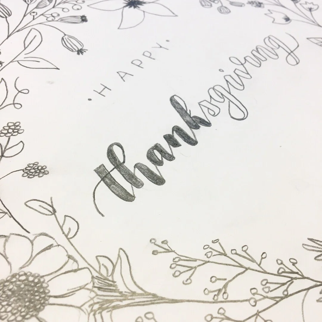 This hand-drawn Thanksgiving wreath and lettering was used for a social media post and printed greeting cards. Created by pencil and pen then brought into Photoshop to add color.