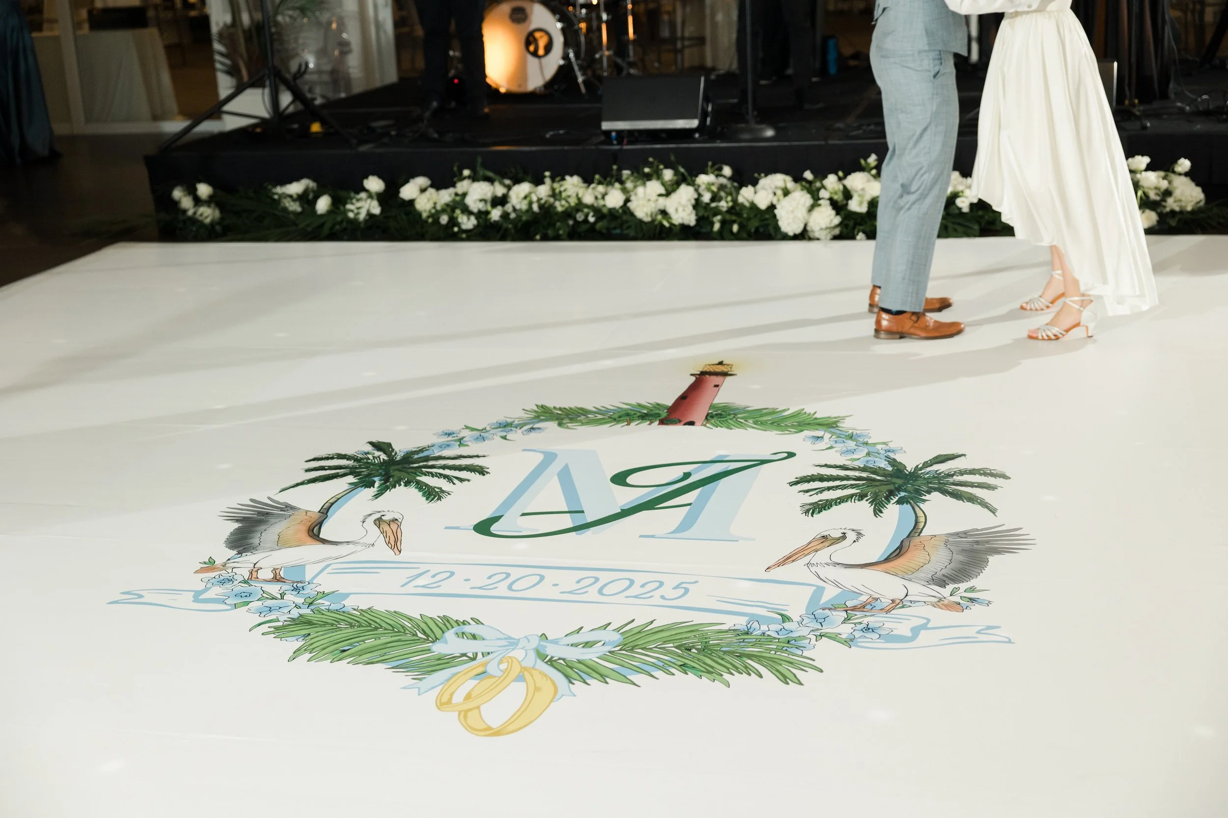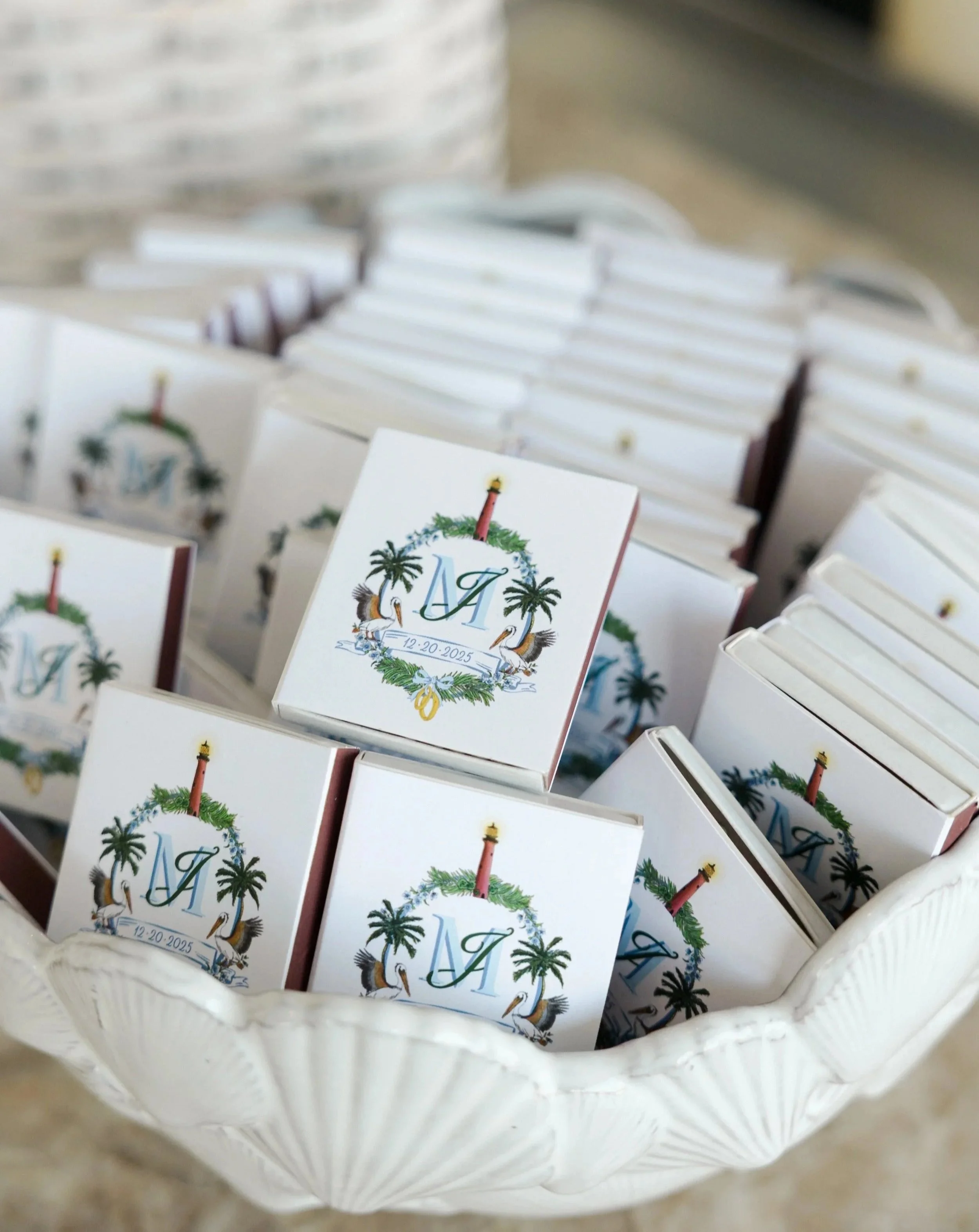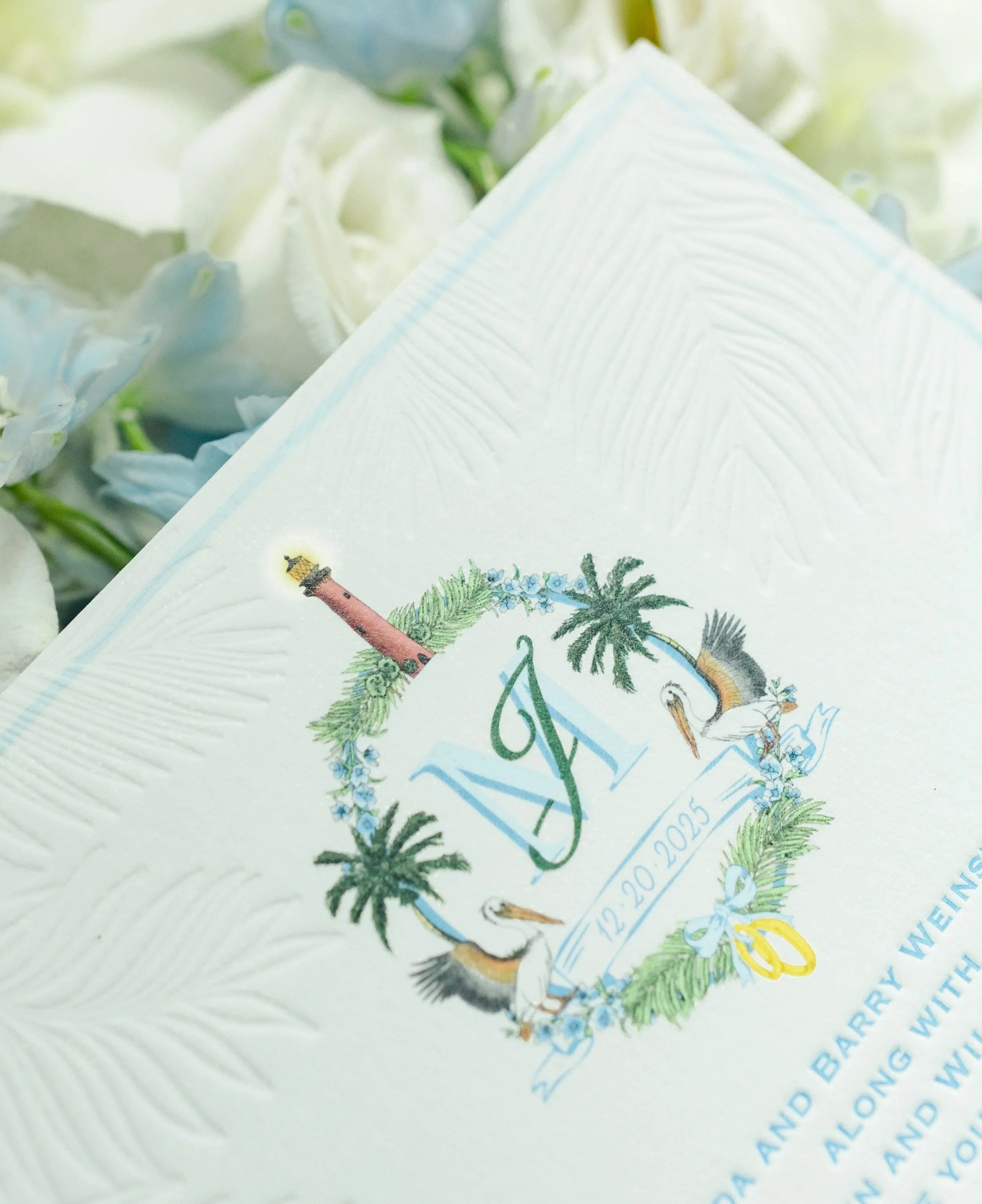 For my wedding, I designed a custom, hand-drawn monogram that served as a visual brand for the entire celebration weekend. The monogram was thoughtfully illustrated to reflect the venue of Pelican Club’s coastal Jupiter, Florida setting, incorporating elements such as the Jupiter lighthouse landmark, pelicans, and palm trees to capture the spirit of the location.