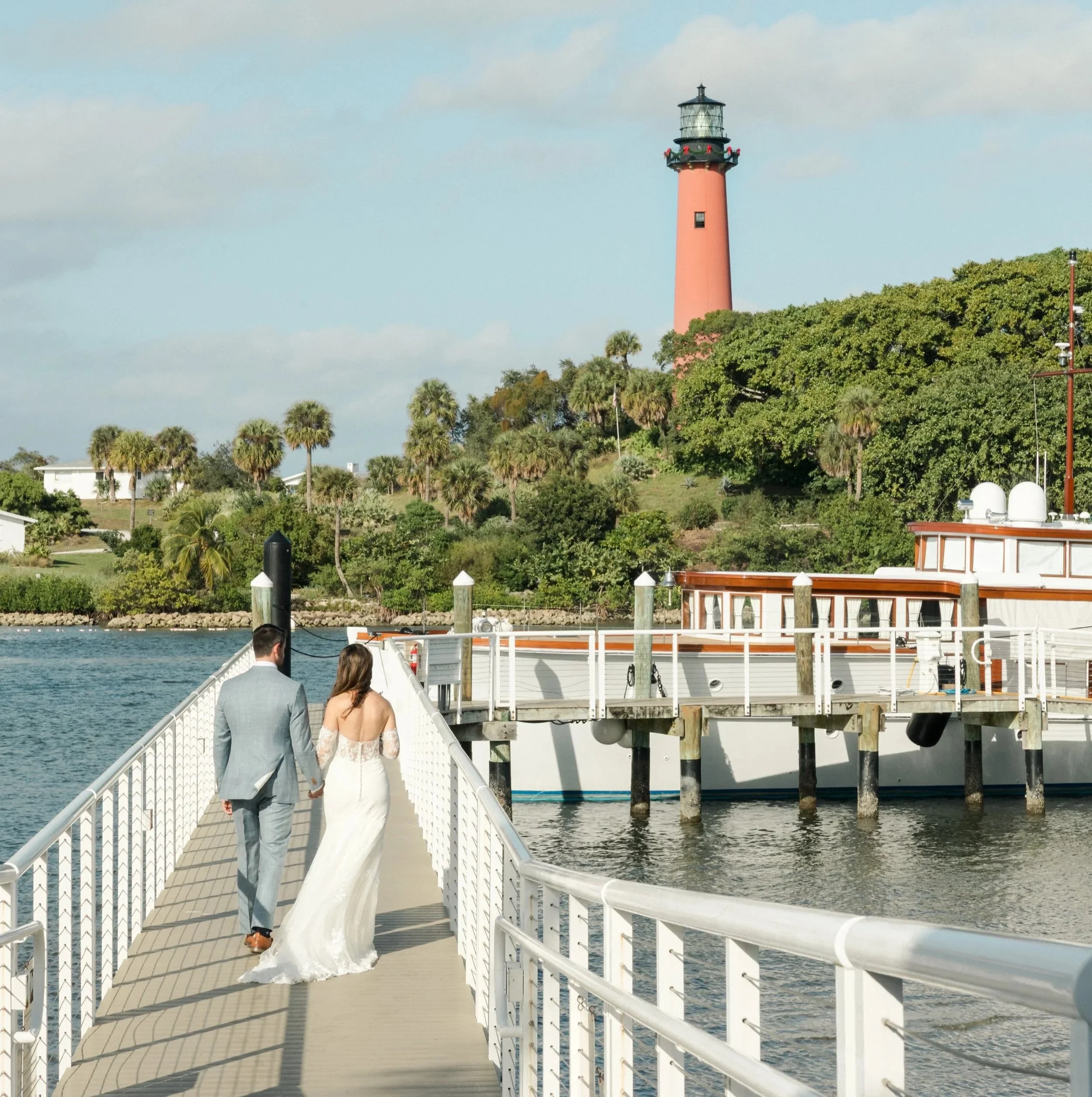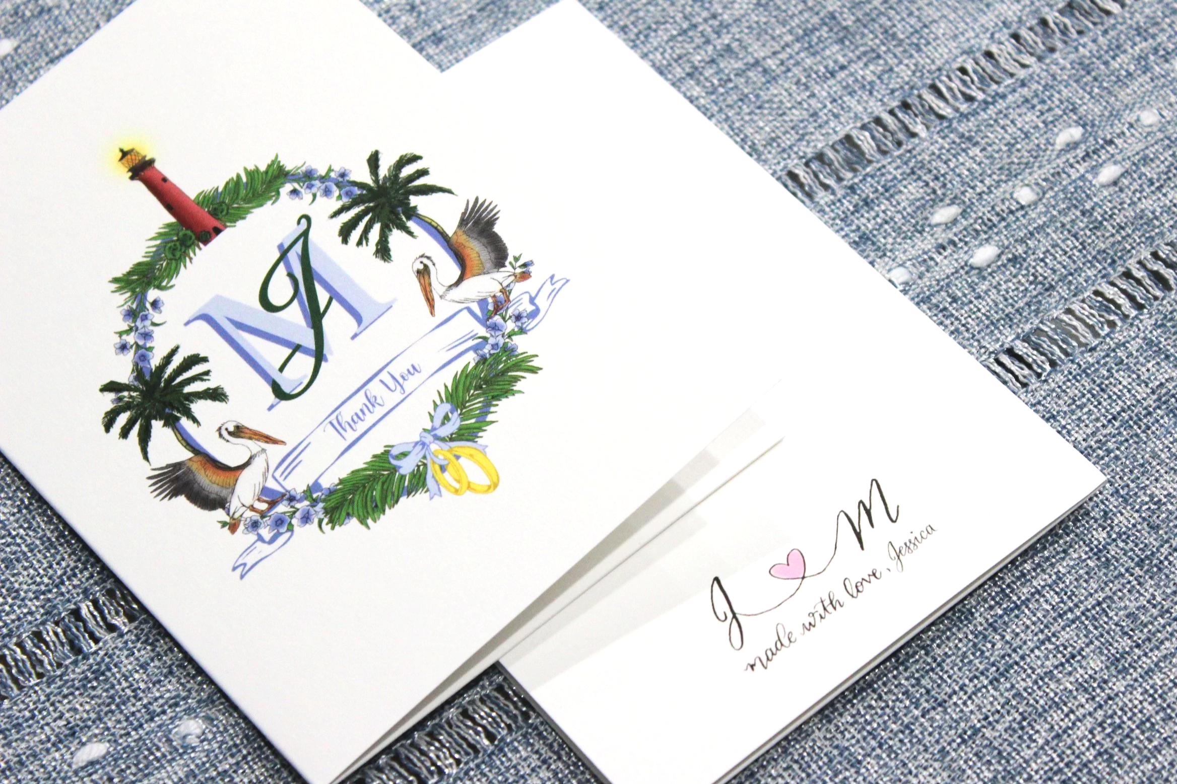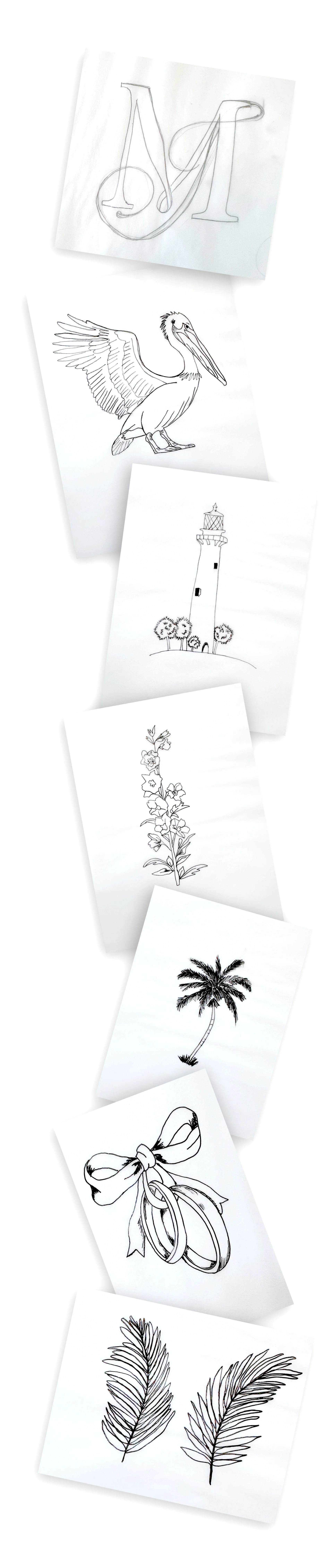 For my wedding, I designed a custom, hand-drawn monogram that served as a visual brand for the entire celebration weekend. The monogram was thoughtfully illustrated to reflect the venue of Pelican Club’s coastal Jupiter, Florida setting, incorporating elements such as the Jupiter lighthouse landmark, pelicans, and palm trees to capture the spirit of the location.